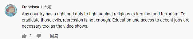 “任何國家都有權利和義務打擊宗教極端主義和恐怖主義。要根除這些邪惡……教育和獲得體面工作的機會也是必要的?!苯眨幻M饩W友Francisca在看完中央廣播電視總臺旗下CGTN播出的《巍巍天山——中國新疆反恐記憶》紀錄片后這樣評價。