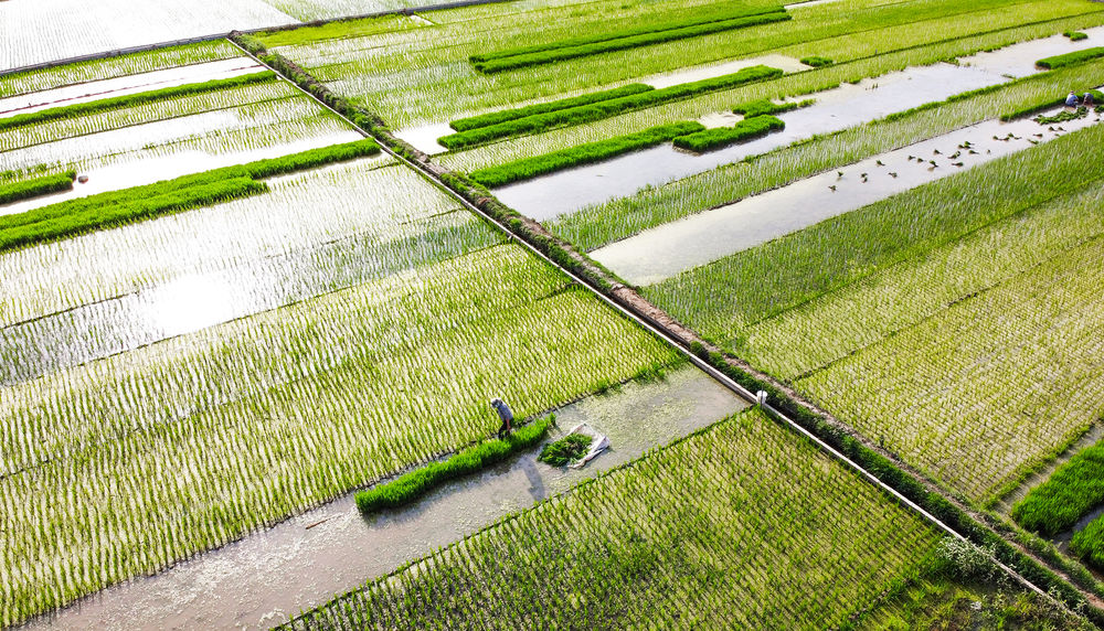 2020年6月14日,農民在洛陽市孟津縣會盟鎮黃河岸邊的萬畝優質水稻種植示范基地內移栽水稻秧苗(無人機照片)。新華社發(黃政偉 攝)