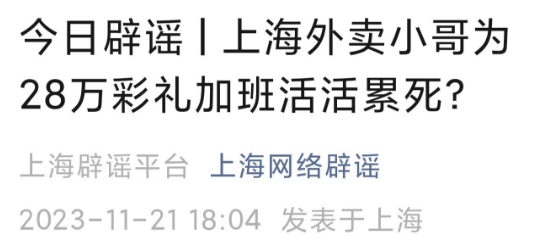 11月20日,上海網絡辟謠微信官方賬號發布辟謠文章。針對近日網傳“為掙28萬彩禮娶媳婦,上海外賣小哥活活累死”一事,經過核查發現,事件純屬自媒體捏造散布。