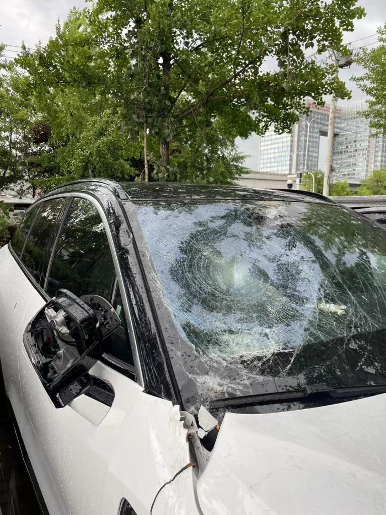 北京市民張先生的車輛在一次較強雷雨天氣中遭樹木砸毀(5月30日攝)。新華社發