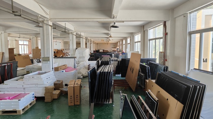 專案組查處違法組裝電視機的車間時發(fā)現(xiàn),庫房內堆積著大量電視機外殼、主板和白板顯示屏,還有很多品牌透明貼紙,以及部分準備發(fā)出和退回的假冒品牌電視機。