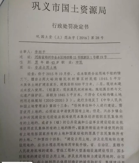 據(jù)記者獲取的材料顯示,2015年12月份,鞏義市國土資源局對李四平進行處罰,案由為“非法占地”。李四平擅自占用集體土地126平方米,建設(shè)農(nóng)家樂,土地性質(zhì)為林地。對其處罰為“自行拆除在非法占用的126平方米土地上新建的建筑物和其他設(shè)施,恢復(fù)土地原狀”“對非法占用的126平方米土地,按每平方米3元處以罰款,共378元?!?/p>