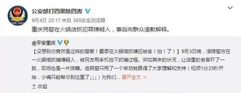 事后,有媒體了解到這名道歉者是來自重慶市涪陵區公安局荔枝派出所的一名民警。據他介紹,當時是正在對一名長期吸販毒的犯罪嫌疑人實施抓捕。由于嫌疑人吸食毒品精神亢奮且隨身攜有刀具,抓捕過程比較激烈,不少店內客人都起身圍觀,有些還拿出手機拍攝。抓捕結束后,帶隊民警第一時間找來餐館老板,亮明身份后表示警方會妥善處理餐館損失,并且特意向店內顧客道歉,于是就有了視頻中顯示的畫面。