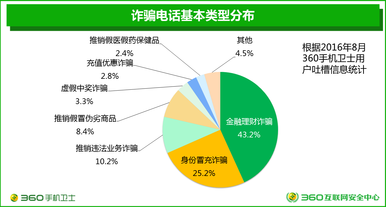 9月7日,360在京發布了國內首份基于大數據研究的電信詐騙分析報告——《2016中國電信詐騙形勢分析報告》。報告中顯示,在用戶接到的所有詐騙電話中,虛假的金融理財詐騙最多,占43.2%,此類詐騙在北上廣深等大城市尤其盛行。其次是身份冒充詐騙,占25.2%。各類虛假的業務推銷電話也是被用戶大量吐槽的詐騙電話類型。