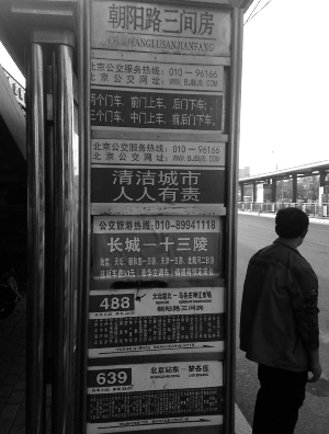 5日,記者來到朝陽區三間房公交車站,見站牌上除了488路、639路站牌和兩塊公益提示牌外,中間出現了一塊顯示著“公交旅游熱線,長城——十三陵”的牌子,牌子下方還有一排小字,寫著北京一些著名景點的一日游,往返車費50元。記者注意到,不同于其他站牌,這塊公交旅游熱線為不干膠質地,表面嶄新干凈,明顯剛粘貼上不久,而正規公交站牌則是不銹鋼的鋼板。
