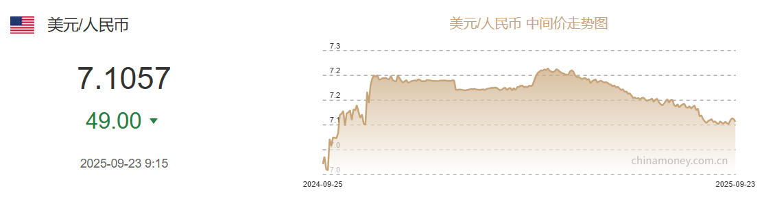 中新網9月23日電 據中國外匯交易中心網站消息,中國人民銀行授權中國外匯交易中心公布,2025年9月23日銀行間外匯市場人民幣匯率中間價為:1美元對人民幣7.1057元,上調49個基點。