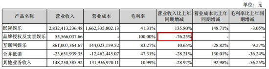 據悉,華誼品牌授權與實景娛樂三種主要產品形態包括:華誼兄弟電影小鎮、華誼兄弟電影世界和華誼兄弟文化城。2015年報告顯示,華誼兄弟品牌授權與實景娛樂板塊累計簽約項目達 13個。該板塊營業收入比上年同期減少了76.25%,王中軍號稱要做20個項目,但財報上能見到的目前僅有海口觀瀾湖項目和蘇州項目。