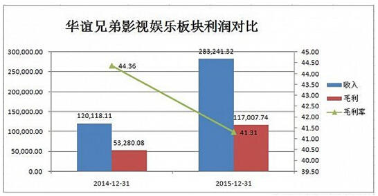 據界面報道,根據財報顯示,華誼兄弟2015年影視娛樂版塊營業收入較上年同期相比增135.80%,達到28.32億元,營業成本較上年同期增長135.80%,達到16.62億,毛利率較上年減少了3.05%,達到41.35%。在報告期內,公司上映的主要是《奔跑吧兄弟》《天將雄師》《梔子花開》、《命中注定》《尋龍訣》《老炮兒》等16部,電影的總票房約43億。
