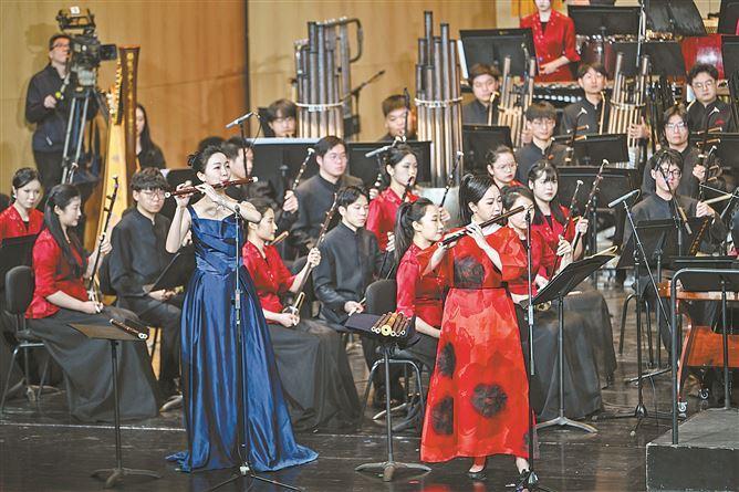 展現“潮”與“年輕態”的當代民樂作品——雙竹笛協奏曲《熱情與冷漠的邂逅》融入了南音元素。(廈門日報記者 林銘鴻 攝)