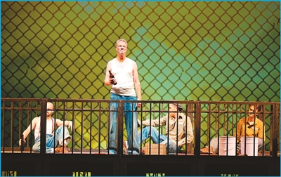 演出開場,鐵絲網幕在昏暗的冷光里升起,囚犯們在鐵籠里形如困獸。這一場景勾勒出肖申克監獄的陰森可怖,壓迫感令人屏息。遇到暴力沖突時,血紅色燈光瞬間籠罩舞臺,渲染出緊張氛圍。每逢監獄操場上的閑談時刻,暖黃色燈光灑下,幕布上的高墻外飄著幾行疏云,透出難得的安適。