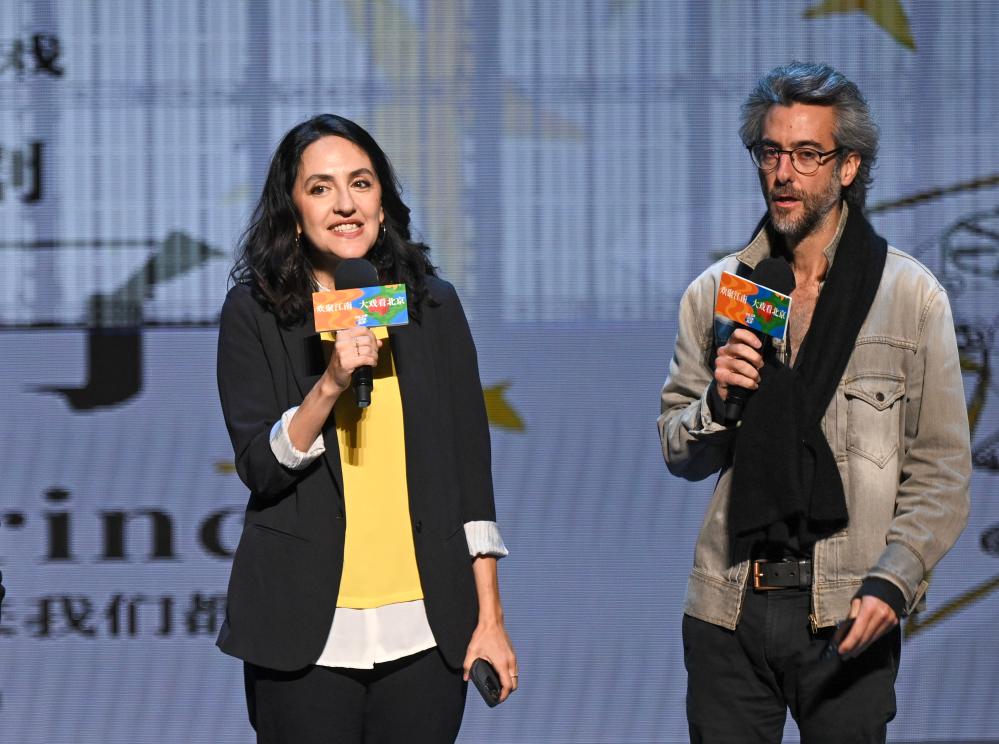 10月12日,在位于北京的中央歌劇院劇場,音樂戲劇《小王子》導演讓·貝洛里尼(右)、總制作人安娜出席發布會。新華社記者 金良快 攝