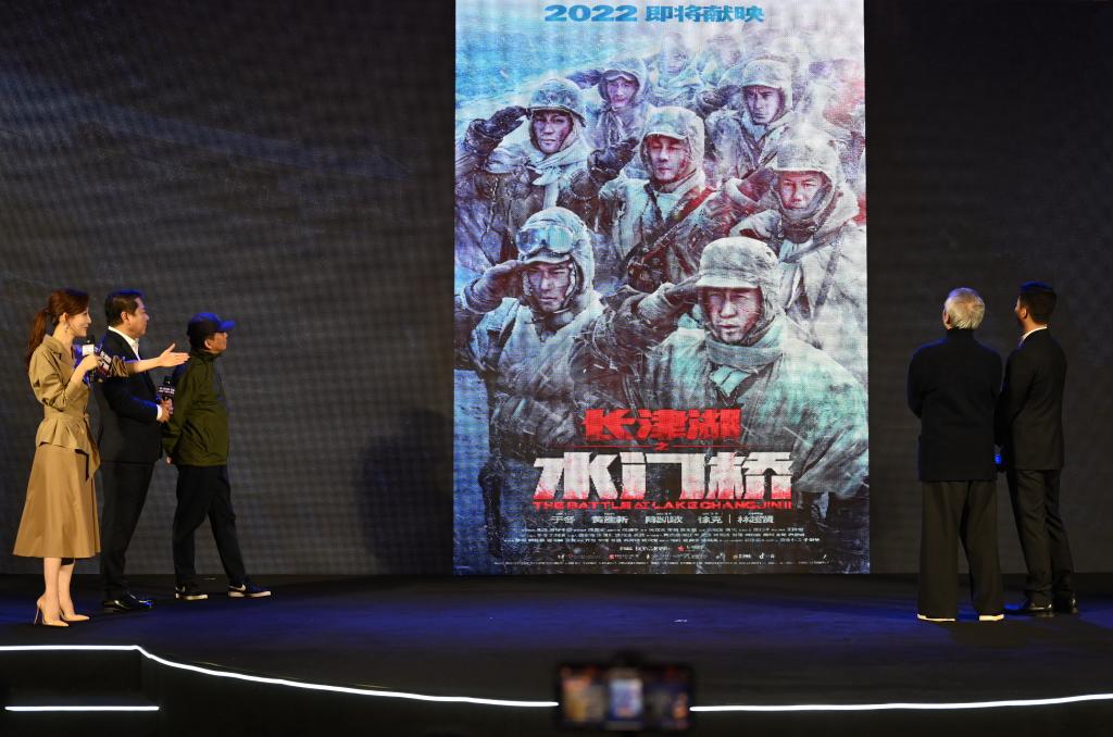 電影《長津湖之水門橋》2021年在廈門舉行新聞發布會,黃建新(左三)為總監制。新華社記者 林善傳 攝