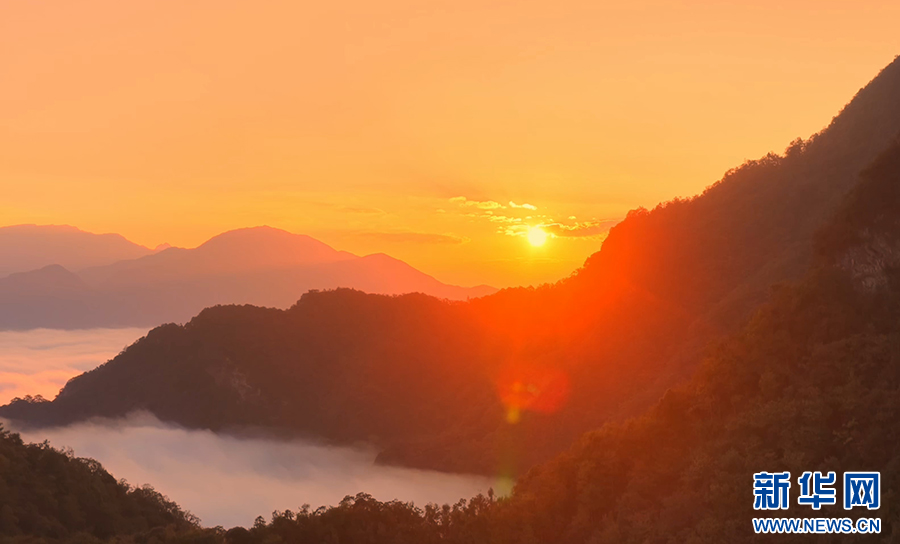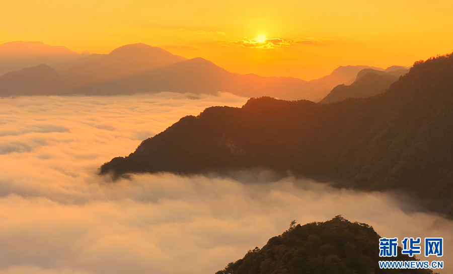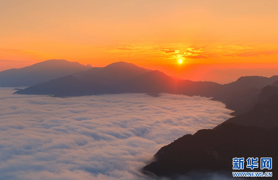 曙光初照,云海翻騰。近日,安徽省池州市石臺縣仙寓山景區在晨光中展現出一幅壯麗的日出云海畫卷。萬頃云濤在層巒疊嶂間奔涌流動,與朝霞金光交織成景,氣象萬千,蔚為壯觀。(王帆 攝)
