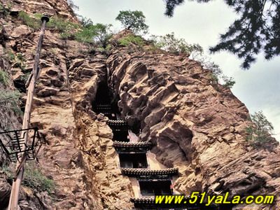 北洞是主體建筑部分。中區有大殿三間,座北向南。原為道教三清塑像,后被佛教改成三世佛。左右耳殿,另有東西配殿各三間,南閣一間。東側迎面山壁上,自然形成龐大的三角形石縫,內有天然石洞,景觀奇特。石縫上端,外建五層樓閣。依崖開鑿卯洞,梁架結構與崖石交接構筑,建造精巧。閣內設有鐵索,扶鐵索可攀援而上。在閣的東邊又有一洞,內建殿三間,名九仙女閣,塑九仙女像。箭閣外塑趙杲泥像,頭頂距石崖僅二指半,故舊稱“趙杲觀,離天二指半”。再往南,就是趙杲觀最險峻的景觀了。峭峰高處,半山腰中,山洞前面,建樓三間。一眼望去,高閣懸空,上峭崖,下絕壁,左右山石如刀削。上下左右根本無路可通。山洞中垂下一條長約20米的鐵索,成了進洞的唯一途徑。只有勇敢的虔誠者或探險者,方可垂直攀索而登,一般人只能望樓興嘆,故鐵索被譽為“仙閣云梯”。三層樓建筑后依山洞,前為磚木結構。上層內塑太上老君、無始天尊、通天教主。中層內塑關圣帝君。下層供修持者居住。當時修筑情景,真令人難以想像。北洞群落,地形險要,峰巒競秀,古木參天,峭峻幽邃,設計大膽,造型奇特。人夸“雁北懸空寺,不及代州趙杲現”說的并不過分。