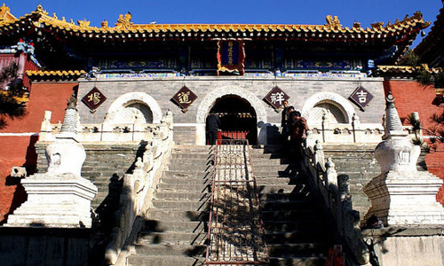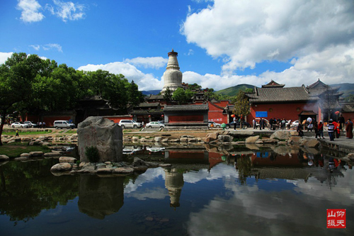 臺懷鎮鎮北有一小峰,人稱靈鷲峰,亦名菩薩頂。所以稱之為靈鷲峰,是因為它的地理形勢頗似古印度摩揭陀國王舍城東北部釋迦牟尼佛說法的靈鷲峰故名。據佛教史籍記載,東漢時期,我國佛教最初的傳播人攝摩騰和竺法蘭來到臺懷鎮,見今菩薩頂的形勢頗似印度的靈鷲峰,因而命名之。所以也稱靈鷲峰為菩薩頂,佛教徒傳說文殊菩薩曾在峰頂顯靈和說法。