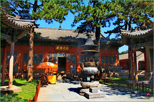 顯通寺的大雄寶殿為舉行佛事活動主要場所,是顯通寺的第三重大殿,殿內(nèi)供著三尊佛像:中是釋迦牟尼佛,西是阿彌陀佛,東是藥師佛;兩旁有十八羅漢像背后有觀音、文殊、普賢三尊菩薩像。觀音殿殿內(nèi),中間供著觀音菩薩像,左右供著文殊和普賢菩薩像。大文殊殿,是顯通寺的第二重大殿。大文殊殿內(nèi),供著七尊文殊菩薩像:正中的為大智文殊;前面的五位,從左至右,依次為西臺獅子文殊,南臺智慧文殊,中臺孺者文殊,北臺無垢文殊,東臺聰明文殊;大智文殊后面是甘露文殊。文殊像前有護(hù)法神韋馱像,兩側(cè)有十八羅漢像。