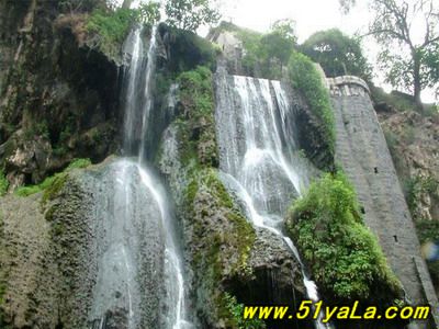 娘子關瀑布,是澤發水的源頭,人稱水簾洞,山坡谷中泉眼累累,形成懸泉。瀑布由多股泉水匯流而成,沿懸崖峭壁傾瀉而下,懸空如白練掛在石壁前,形成高達十幾丈高的飛流。“海眼”是最大的泉眼,泉水翻滾,激起層層浪花,響聲震耳。瀑布旁有“趵突泉”突突噴涌,并有諸多小“趵突泉”相映襯。一股股水流噴吐冒出,浪花紛飛,日夜不息,常年涌流,給娘子關風光增色不少。