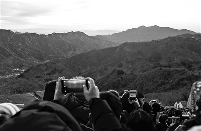 2018年一天,來自各地的數百游客在早晨6時許,紛紛登上慕田峪長城,迎接2018年的第一縷曙光,為新的一年祈福。