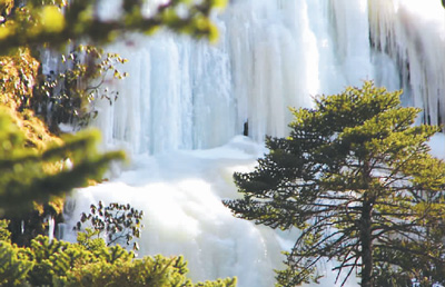 在著名的三疊泉瀑布前,原本飛流直下三千尺的壯觀場面不見了,呈現在游客眼前的是一條巨大的玉帶倒掛在崖壁上。險峻的石巖上,已是懸崖百丈冰,不少參差不齊的冰凌懸掛在石巖上,往日桀驁不馴的瀑布此時變得溫馴了。整個山澗白茫茫一片,被晶瑩剔透的冰柱所覆蓋,銀裝素裹,氣勢恢宏,場面極為壯觀。此時雖聽不到往昔轟隆隆的瀑布聲,但能一睹這懸掛在石崖上的冰瀑,卻是別有一番景致。