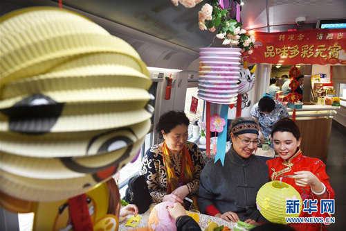 當日,中國鐵路濟南局集團有限公司在部分列車上開展“品味多彩元宵共享幸福旅程”活動,舉行猜燈謎、品元宵、展茶藝、做花燈等活動,邀請旅客共同參與。 新華社記者 李紫恒攝