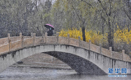 4月3日,市民在延慶區一個公園中賞雪。當日,華北中部地區氣溫驟降,位于燕山山脈腳下的北京市延慶區降下一場春雪。 新華社記者 李欣 攝
