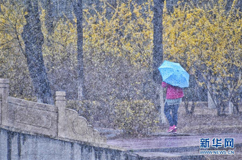 4月3日,市民在延慶區一個公園中賞雪。當日,華北中部地區氣溫驟降,位于燕山山脈腳下的北京市延慶區降下一場春雪。 新華社記者 李欣 攝