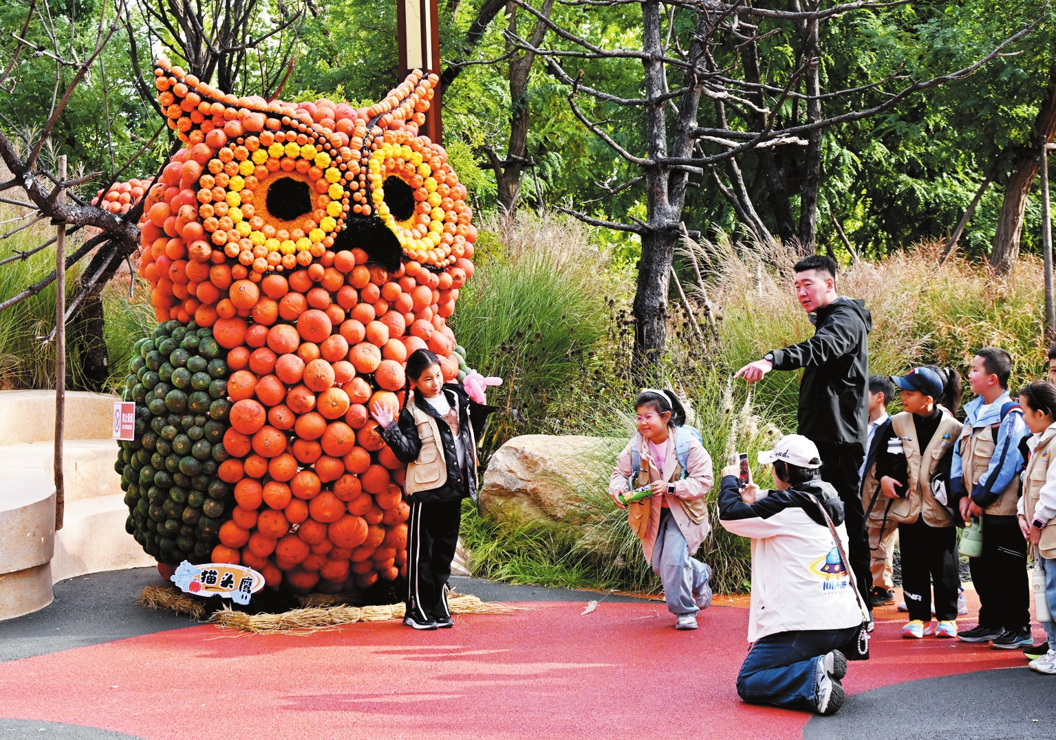 近日,青島東方伊甸園舉行“南瓜藝術王國”主題展。圖為小朋友在排隊與“南瓜貓頭鷹”合影。 新華社記者 李紫恒 攝