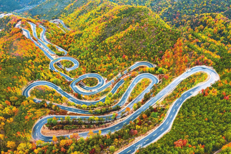 10月17日拍攝的左權縣太行龍泉風景區景色。太行一號旅游公路北天池段,似長龍盤旋在五彩斑斕的太行秋色之中,峰回路轉,風景秀麗,繪成一幅絕美的天然畫卷,帶領游客開啟詩意之旅。