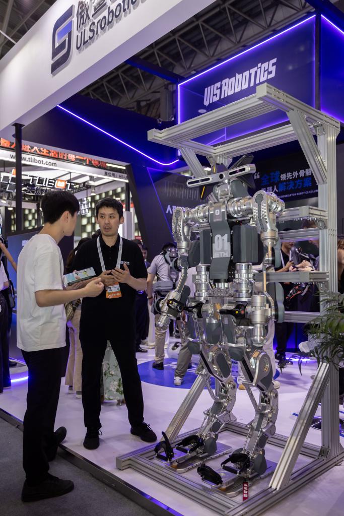 “這臺人形機器人可實現人形與外骨骼雙模式工作,結合力控與感知能力、大模型人工智能訓練,完成在礦山、電力、應急等野外復雜環境中的作業、任務等。”上海傲鯊智能公司市場總監張華說。