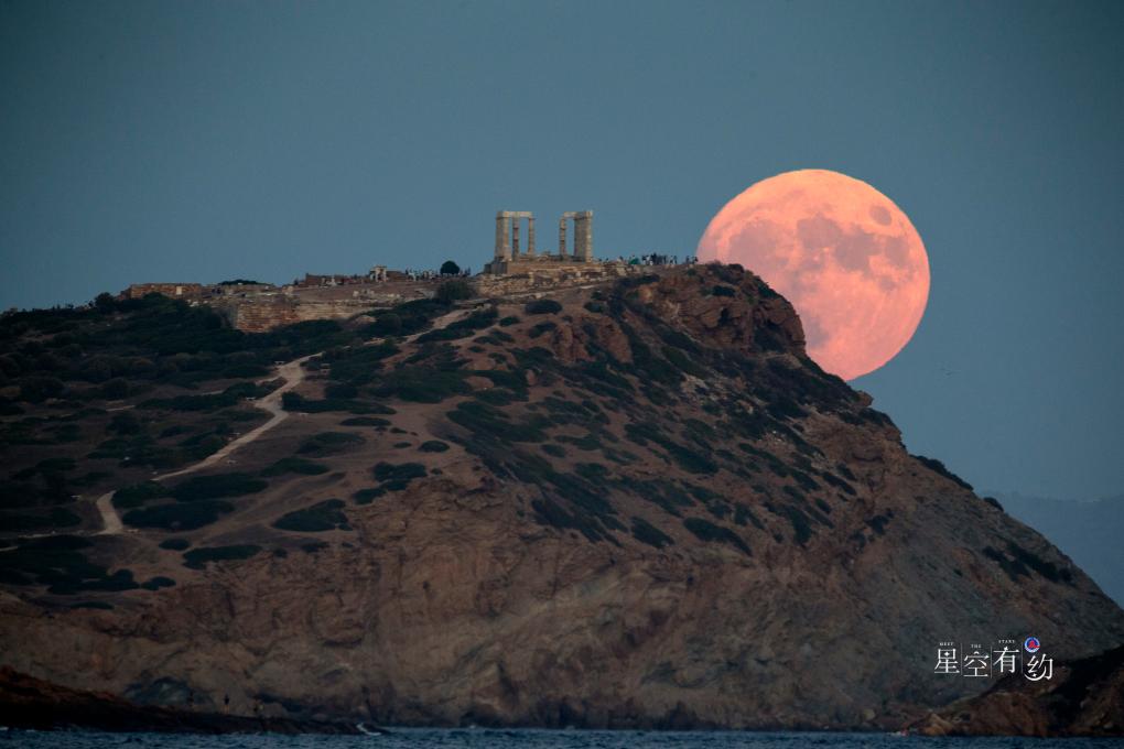 2023年8月30日,“超級月亮”從希臘蘇尼翁角的波塞冬廟上空升起。新華社發(馬里奧斯·羅洛斯攝)