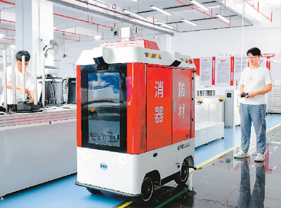 福建省福州市倉山區大力發展以智能制造為主導的新一代信息技術產業,通過人才引進、科技創新、強化金融服務和落實財稅等惠企政策,積極打造數字經濟核心產業集聚區。圖為技術人員在福建漢特云智能科技有限公司生產線上調試消防智能巡邏機器人。新華社記者 魏培全攝