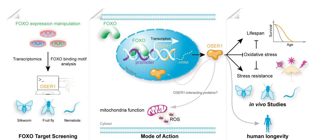 為了闡釋OSER1調(diào)節(jié)長壽的作用機(jī)制,研究團(tuán)隊在家蠶、線蟲和果蠅中進(jìn)行了一系列的分子生物學(xué)實驗。研究結(jié)果共同表明,OSER1是叉頭框蛋白O的直接靶基因,OSER1能夠響應(yīng)過氧化氫誘導(dǎo)的氧化應(yīng)激,并通過提升機(jī)體氧化應(yīng)激防御力發(fā)揮延長壽命的作用。