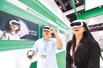 隨著數字金融領域創新成果不斷投入應用,刷掌支付、虹膜識別支付等支付手段逐步走進居民生活。圖為觀眾在2024中國國際金融展上通過虛擬現實設備體驗微信虹膜識別技術。陳曉根攝(人民視覺)