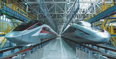 圖為兩列CR450動車組樣車停靠在湖北宜昌動車所。唐 瑩攝(人民視覺)