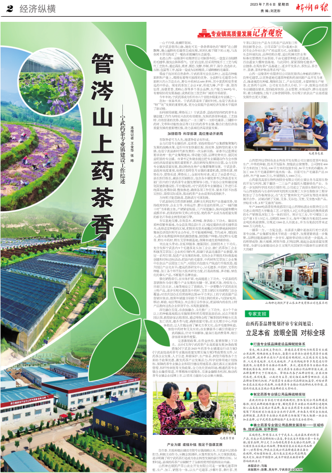 為促進寧武藥茶專業鎮高質量發展,寧武縣以優質資源要素為支撐,堅持政府扶持、企業管理、市場運作、整合推進的原則,全縣實施包括“市場主體倍增”“創新能力提升”“就業富民賦能”“質量品牌提升”“銷售市場拓展”“重大項目攻堅”和“產業要素保障”等在內的七大行動,以1軸4鎮10村為承載主體,產銷緊密銜接,三產深度融合,縱向延鏈和橫向成群并舉,藥茶藥材和功能食品互促,推動藥茶產業由成型向成勢躍升。