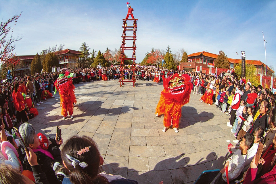 運城市鹽湖區舜帝陵景區內舞獅隊正在進行舞獅表演。姜樺攝