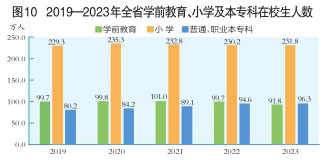 全年全省研究生教育招生2.1萬人,在學研究生6.1萬人,畢業生1.6萬人。普通本科招生14.7萬人,在校生55.1萬人,畢業生13.8萬人。職業本專科招生13.8萬人,在校生41.2萬人,畢業生12.5萬人。中等職業教育招生13.8萬人,在校生41.6萬人,畢業生13.5萬人。普通高中招生21.2萬人,在校生67.8萬人,畢業生22.1萬人。初中招生37.1萬人,在校生112.2萬人,畢業生34.9萬人。小學招生39.9萬人,在校生231.8萬人,畢業生37.9萬人。特殊教育招生0.4萬人,在校生2.0萬人,畢業生0.4萬人。學前教育在園幼兒91.8萬人。(圖10)