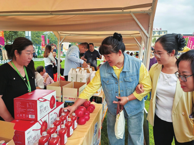臺上歡歌快舞慶豐收,臺下熱熱鬧鬧逛大集。產品展銷現場,人頭攢動、熱鬧非凡,游客品嘗豐收美食、體驗豐收喜悅。售賣農產品的農民嗓門大、笑容甜:“郊區西南舁的蘋果,嘎啦脆,您嘗嘗!”“平定的黃瓜干,好吃,有嚼勁!”“今天剛從地里摘的老南瓜,又糯又甜!”“家里走地雞下的蛋,特別香!”