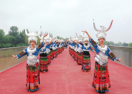 10月2日9時許,一曲高亢的苗族飛歌點燃了現場的氣氛。景區入口處,百余名來自貴州的苗族演員身著精美的傳統盛裝,以苗族同胞對來客最崇高敬意的“攔門酒”儀式歡迎八方來客。銀飾閃爍,鼓聲激昂,歡快的踩鼓舞、互動十足的竹竿舞等接連上演,令人目不暇接。