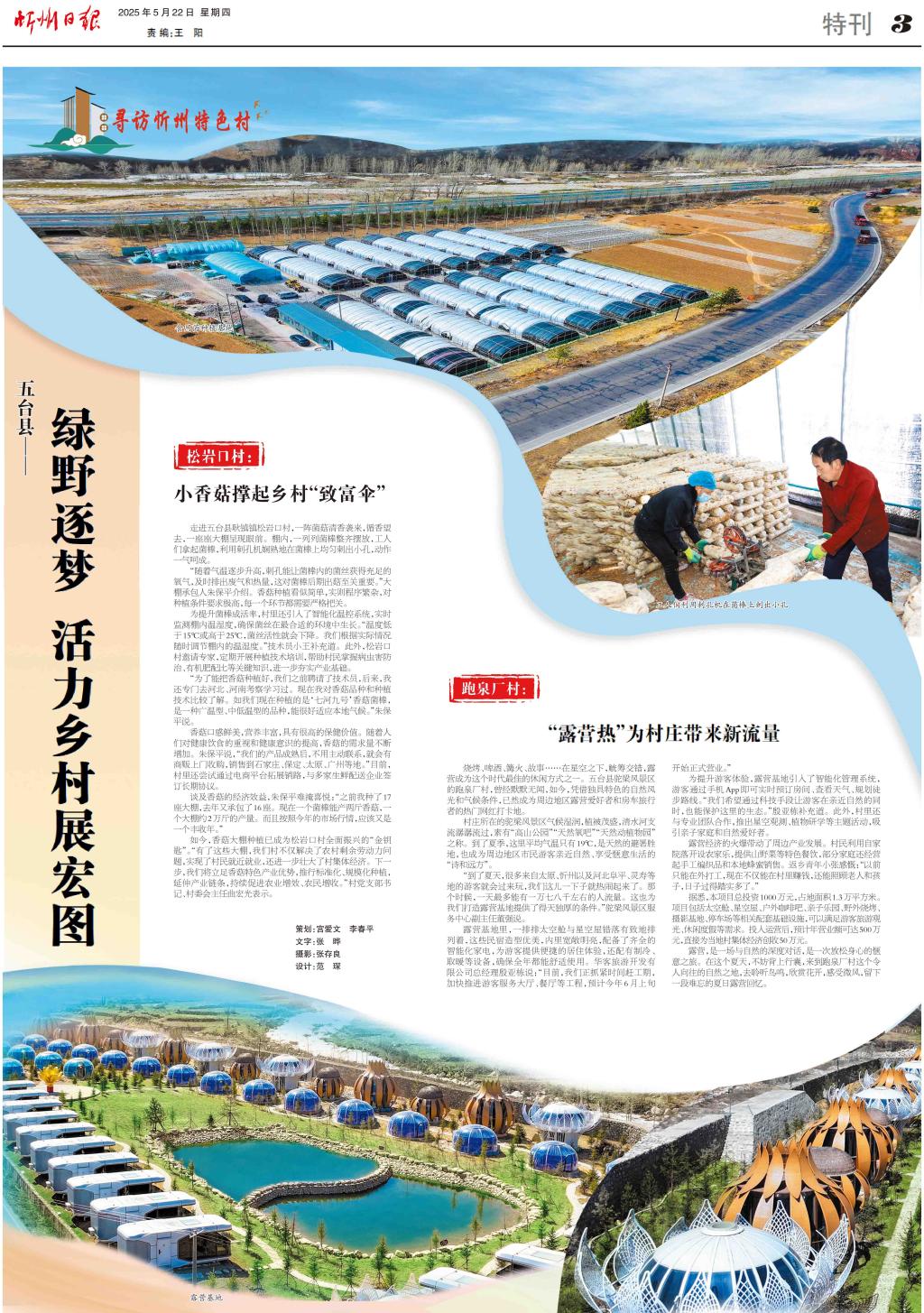 走進五臺縣耿鎮鎮松巖口村,一陣菌菇清香襲來,循香望去,一座座大棚呈現眼前。棚內,一列列菌棒整齊擺放,工人們拿起菌棒,利用刺孔機嫻熟地在菌棒上均勻刺出小孔,動作一氣呵成。