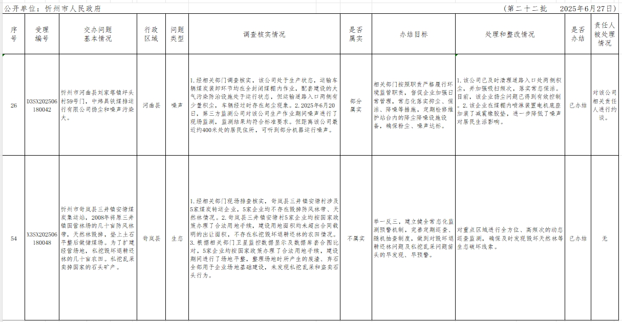 中央生態環境保護督察組群眾信訪舉報轉辦和邊督邊改公開情況一覽表(第二十二批)