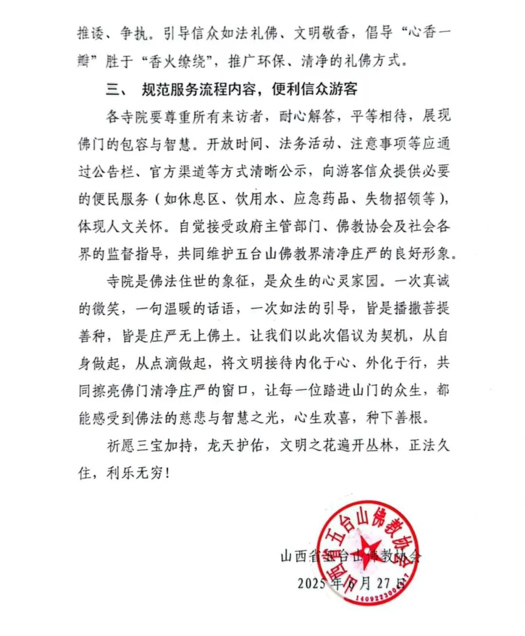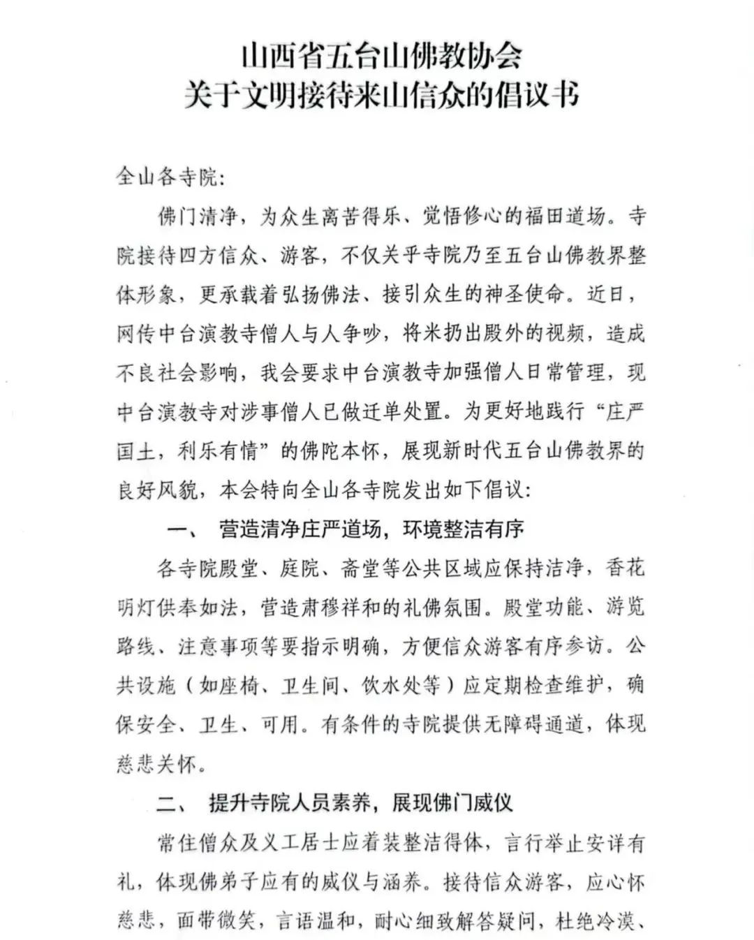 山西省五臺山佛教協會關于文明接待來山信眾的倡議書