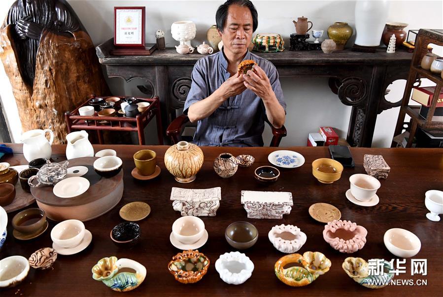 在河南省鞏義市站街鎮小黃冶村的工作室里,游光明在查看他燒制的“三彩雕花杯”(6月19日攝)。新華社記者 李安 攝