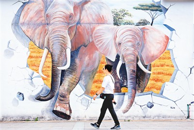 游客行走在安徽省合肥市廬江縣湯池鎮果樹村文化廣場藝術畫前。王閩 攝(人民圖片)