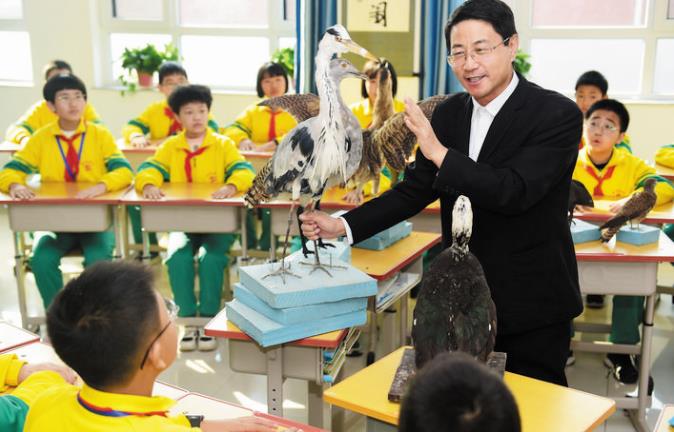 11月是河北省保護野生動物宣傳月,滄州市野生動物救護中心的專家走進中小學(xué)校,向?qū)W生們宣講愛鳥護鳥知識,引導(dǎo)孩子們從小樹立尊重自然的生態(tài)文明理念,積極參與野生動物保護活動。圖為11月10日,在滄州市河間英華學(xué)校,滄州野生動物救護中心的專家孟德榮教授為學(xué)生們講解愛鳥護鳥知識。新華社發(fā) 傅新春 攝