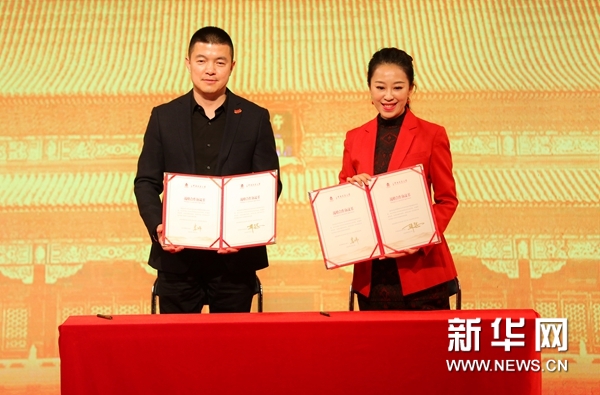 簽約儀式現場,左起故宮博物院副院長婁瑋與中央民族樂團副團長、琵琶演奏家趙聰合影。