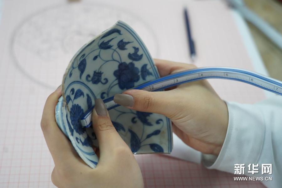 修復師何奕慧在測量一件瓷器,將三維瓷器上的圖案還原到二維的紙面上,必須要經過仔細的測量(12月3日攝)。新華社記者 周密 攝