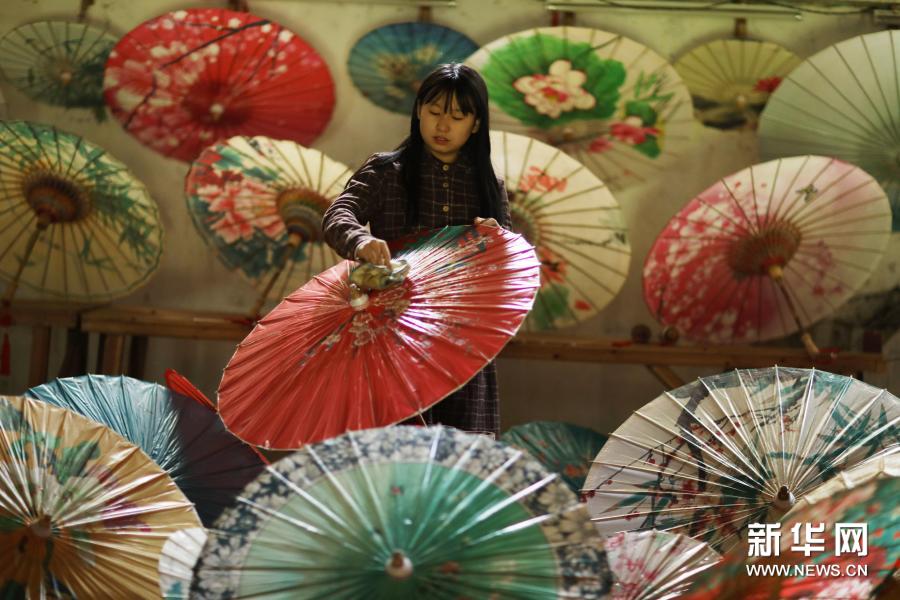 2019年6月,“赤水油紙傘制作技藝”被列入貴州省級非物質文化遺產名錄。當地依托大同古鎮的旅游產業,采取政策引導、資金扶持等方式,鼓勵民間藝人重拾油紙傘制作技藝。油紙傘產品投放旅游市場,深受消費者青睞。油紙傘制作不僅帶動眾多群眾就業增收,也讓油紙傘技藝重新煥發生機。新華社發(王長育 攝)