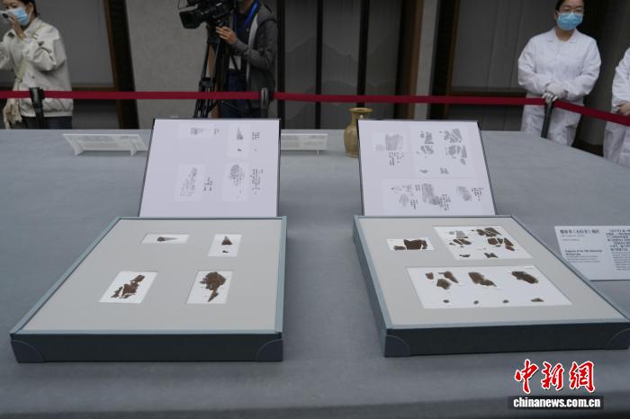 10月13日,流失海外79載的長沙子彈庫戰國帛書第二、三卷《五行令》與《攻守占》正式入藏湖南省博物館。圖為楚帛書《五行令》殘片。中新社記者 楊華峰 攝