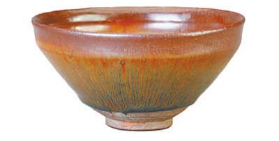 曜變建盞是建窯瓷器的名貴品種,可遇不可求,呈現為釉面散布大小不一的稀疏空心狀斑點,斑點外緣隨光線散發出紅、綠、天藍等彩色光暈。光暈之外是流光溢彩的豎向絲毫,色彩豐富且有立體感,猶如天上的群星浩瀚深邃。